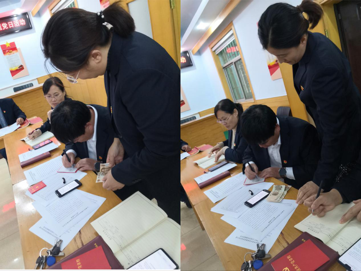 首先,全體黨員逐個(gè)向支部繳納了本月黨費(fèi),并進(jìn)行了黨費(fèi)收繳臺(tái)賬登記。